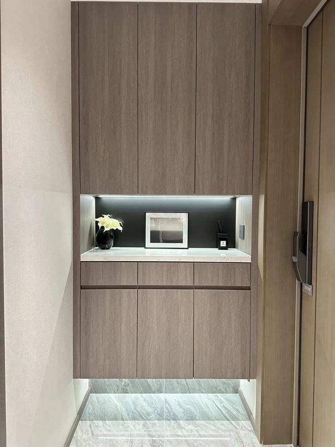入户玄关更是设计了大量的收纳空间。底部架空,可拿来摆放鞋子,并设置有嵌入式灯带,整体的氛围感拉满。