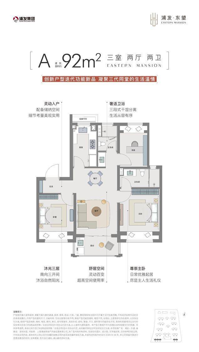 而浦发东望通过飞机户型设计、合理的功能规划等,做到了两个卫生间,缓解早高峰时“抢卫生间”的不便,却又不失尺度感