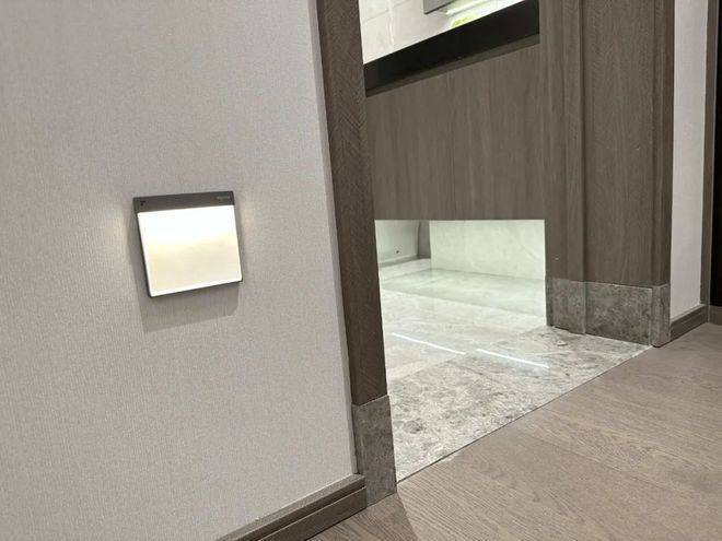 还有,洗手间过道墙面细心地安装了过道感应小夜灯,白天不亮,但晚上主人黑暗环境下走过,感应灯都会自动亮起,保证居住的便捷以及安全。