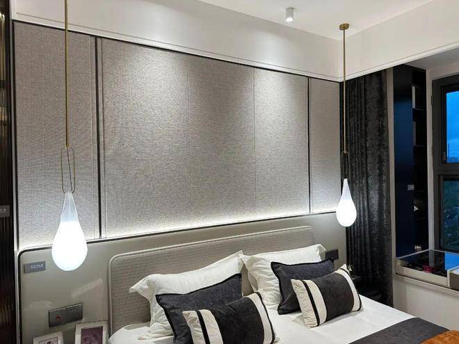 主卧床背景墙进行了软包处理,省去了业主未来二次装修的时间、精力跟成本,更好的给业主一个舒适且高颜值的家。